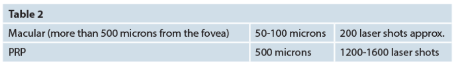 Laser treatment settings will always be variable and based upon the clinical situation, indication and patient factors. However, there are certain basic guidelines, which provide a framework for treatment settings. These are summarised in Table 2 from Diabetic Retinopathy Study (DRS) and Early Treatment Diabetic Retinopathy Study (ETDRS) studies. It is proposed that this treatment is applied over two sessions [9]. Furthermore, specific ischaemic portions of retina maybe treated based on fundus fluorescien angiography (FFA) results.
