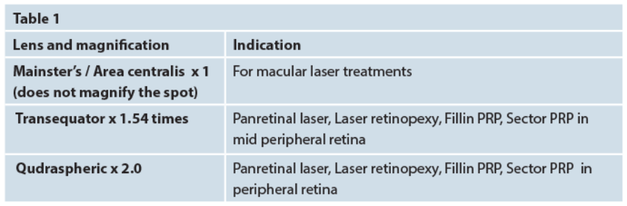 The most common contact slit-lamp lenses (Figure 1) used to administer retinal laser treatment in most ophthalmology departments are listed in Table 1. Each lens has its own merits and indications.