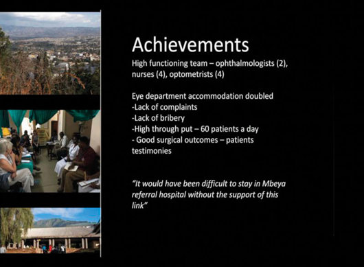 From Tanzania, ophthalmologist Barnabas Mshangila presented the LINK between Mbeya Referral Hospital and Altnagelvin Hospital in N Ireland. He described how the LINK had strengthened the eye care services that he and his team provide. Before the LINK began there used to be about 20 patients per week; now they were seeing more than 60 per day. Rosie Brennan, LINK lead for Altnagelvin, said that her eye department had benefited from team-building during their training visits to Mbeya; it was much easier to make changes in working practices at Altnagelvin as the team was more cohesive and understood each other’s strengths and expertise.