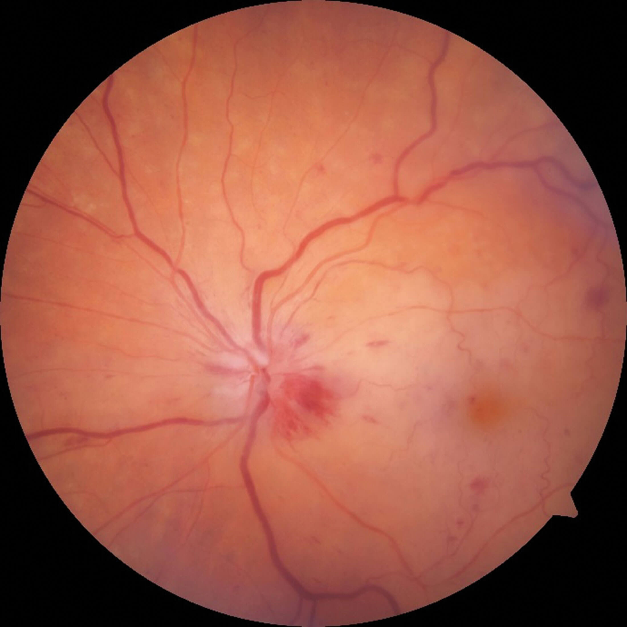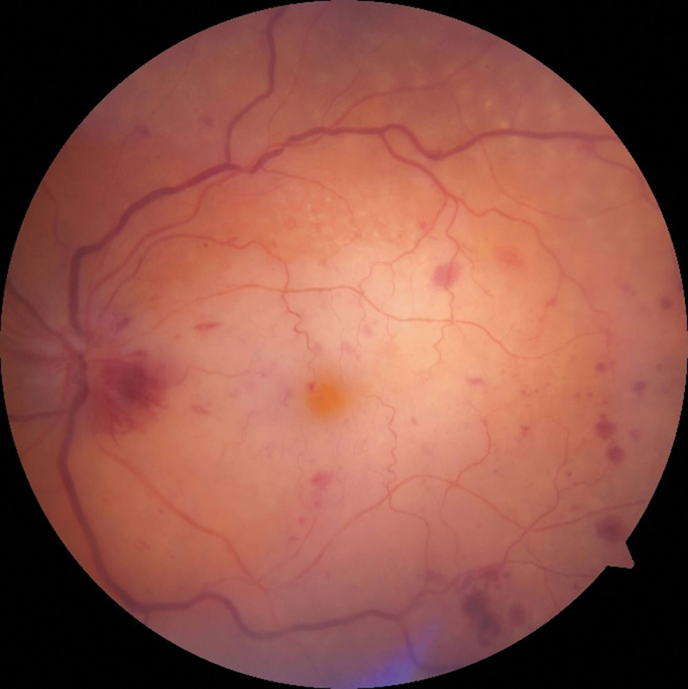 - Presence of multiple dark deep intraretinal haemorrhages.