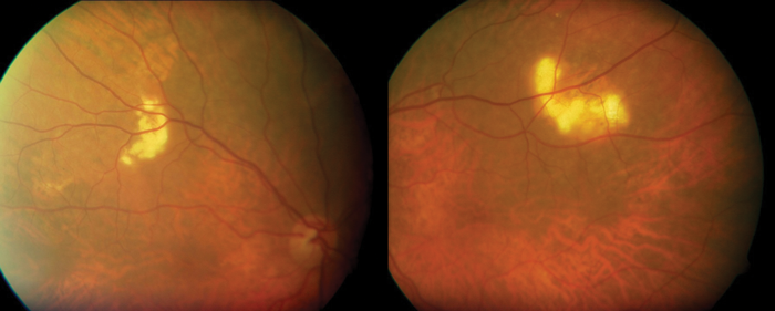 Deposition of calcium in this nature was initially described by Pagenstecher in 1860 [1]. Its clinical differential diagnosis includes choroidal osteoma, choroidal metastasis, choroidal melanoma, choroidal amelanotic naevus and choroiditis [2]. The lesions are mainly observed in the mild-peripheral fundus close to the superotemporal arcade as multiple, well-defined, elevated yellow plaque-like lesions [3]. The lesions have echographic patterns consistent with calcification which are often documented in both the choroid and sclera. Lesions have frequently been documented in the choroid alone but never alone in the sclera [4]. It is important to highlight that patients who have such lesions also have normal calcium metabolism.