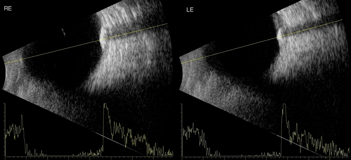 An 83-year-old caucasian male was referred by his optometrist querying the cause of bilateral superotemporal fundal lesions. The patient was visually asymptomatic with an unremarkable past medical history. Clinically visual acuity was Right: 0.36 logMAR improving to 0.26 logMAR with pinhole and Left: 0.6 logMAR improving to 0.04 logMAR with pinhole. The anterior segment assessment showed moderate cortical lens opacity bilaterally and dilated fundoscopy revealed evidence of slight raised yellowish lesions (Figure 1) on the superior aspect of the superotemporal arcade bilaterally. B-scan ultrasound examination revealed highly reflective lesions and confirmed the clinical diagnosis of bilateral sclerochoroidal calcification (Figure 2).