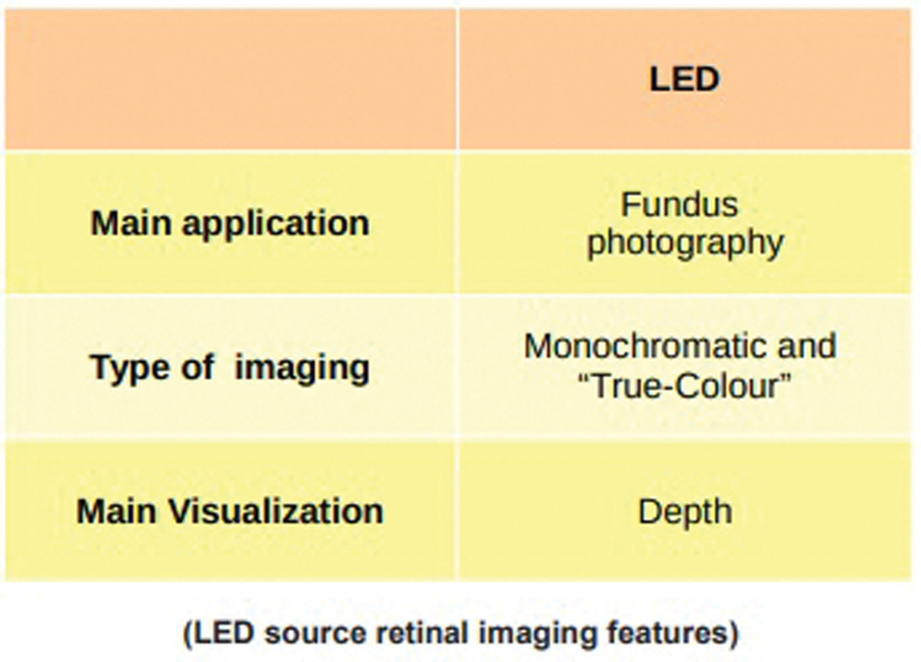 LED light sources, most recently used in retinal photography devices, offer higher quality performance compared to the flash source. The LED beam does not dazzle patients, it emits a less dispersive light spectrum and the colour is much more similar to ‘flash-based’ retinal photography than retinal photography with LASER. This type of source is less affected by the conditions of the environment in which it is used and is clearly less affected by the conditions of the ocular structures (LED retinal imaging can offer both ‘pseudo colour’ and ‘true-colour’ images).