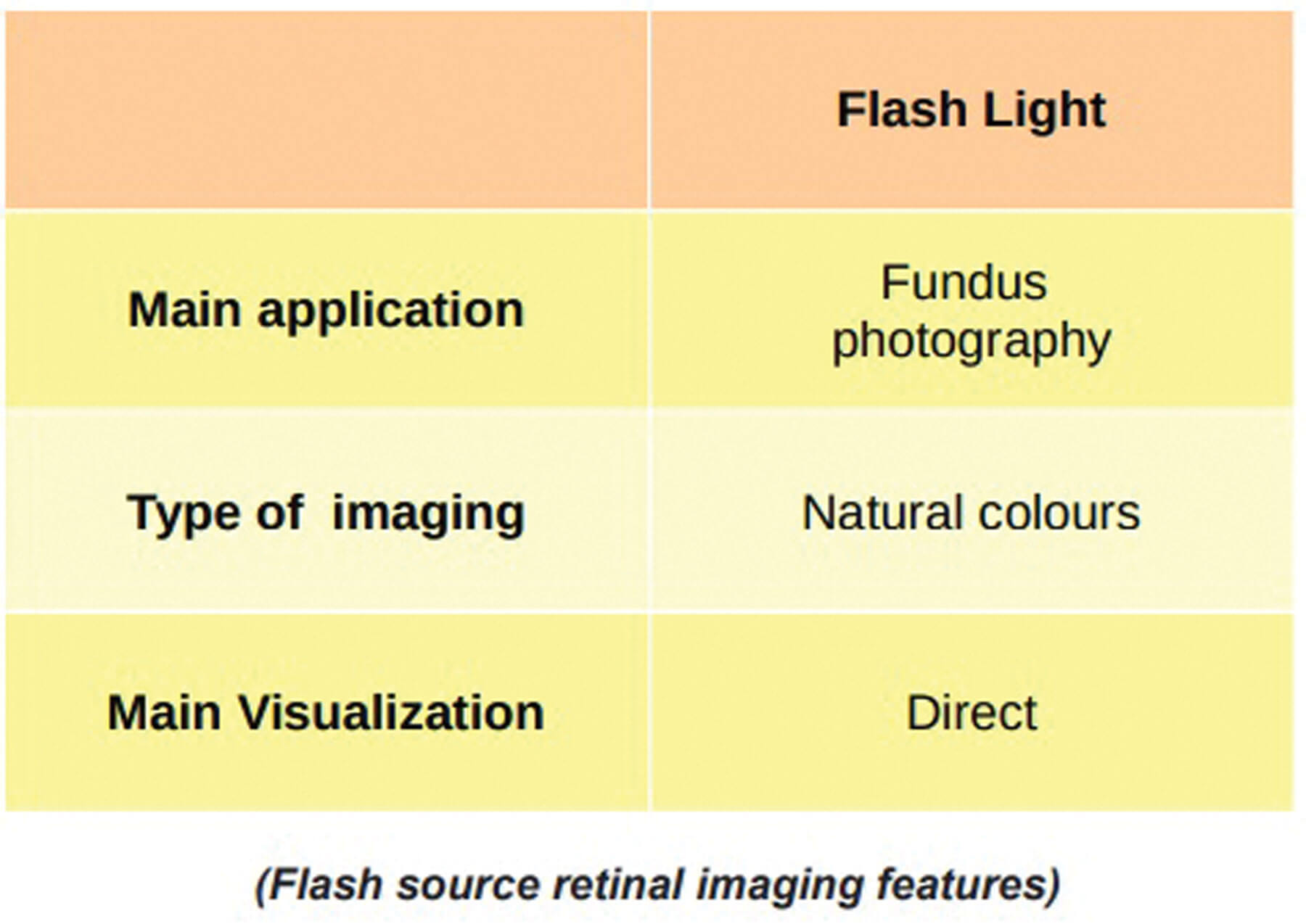 As anticipated, we find this type of light source mainly in cameras, and over the years it has been constantly modified thanks to various technological and engineering innovations. The light emitted by a flash is an artificial type of light, with characteristics similar to natural light. It is generally electronically powered (battery system); this type of light source thus offers natural colour details in retinal photography which powers the circuit consisting of transformer, amplifier and condenser. The condenser is charged; the charge of the condenser is amplified in voltage by a transformer on a Xenon tube (or lamp) which emits the flash of light. This type of light source offers a full-spectrum, phase-non-coherent, non-unidirectional electromagnetic wave [6,7].