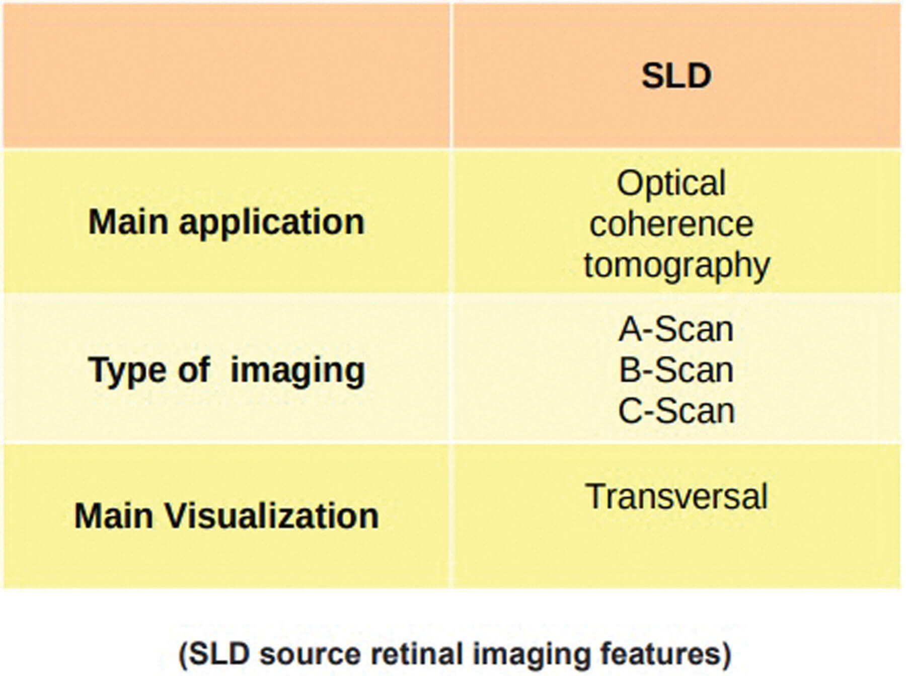 It is a hybrid of LASER and LED: combining the output power and brightness of the first with the broad optical spectrum of the second. These characteristics make the SLD source optimal in the acquisition of OCT imaging, as it allows us to obtain particularly accurate and high resolution measurements. In Figure 7, the main characteristics of these light sources have been summarised and simplified to appreciate their different properties.
