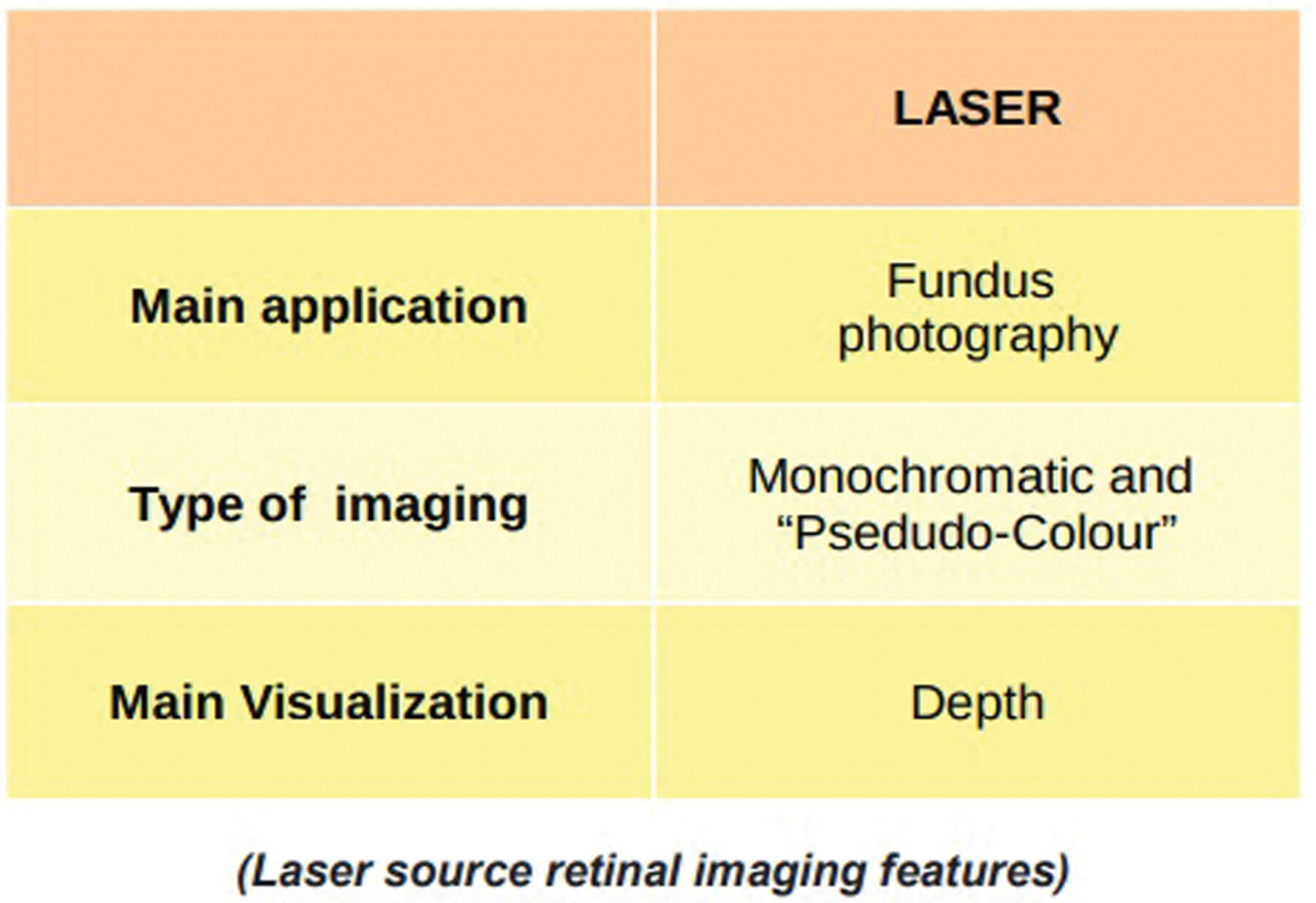 LASER light sources offer the possibility of acquiring a monochromatic or, in some cases, polychromatic image (offered by several LASER sources in simultaneous acquisition, named ‘false colour’ or ‘pseudo colour’). The advantage of this type of acquisition is the possibility of observing the retinal image obtained at different depth levels in post-acquisition and in some cases with the most advanced retinal imaging devices even during acquisition. This is because compared to ‘flash-based’ source photography, LASER source photography has a much greater tissue penetration and can offer useful results even in the presence of ocular structures that are not perfectly transparent. Furthermore, this type of source does not create glare for patients.