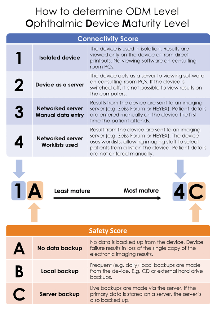 An Ophthalmic Device Maturity (ODM) level should be determined for each ophthalmic imaging device. Level 1A is the worst and level 4C is the best. The value from 1 to 4 denotes the connectivity of the device. The letter from A to C reflects the level of data backup or safety. Aiming for a level of 4C should be possible for most devices. Some older devices (without DICOM support) will be limited to level 3C. All imaging devices, whether slit-lamp cameras or a mobile B-scanners should be graded. The ODM level scoring scheme can be seen in Figure 1.