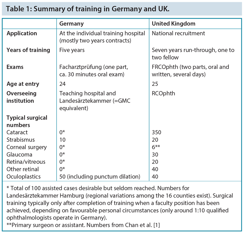 If your primary goal is to become an eye surgeon, the UK seems to remain one of the most attractive countries to train, as you will be likely to get higher surgical numbers than elsewhere including Germany. However, there are also significant regional variations in surgical training experience across the UK deaneries [1,2].