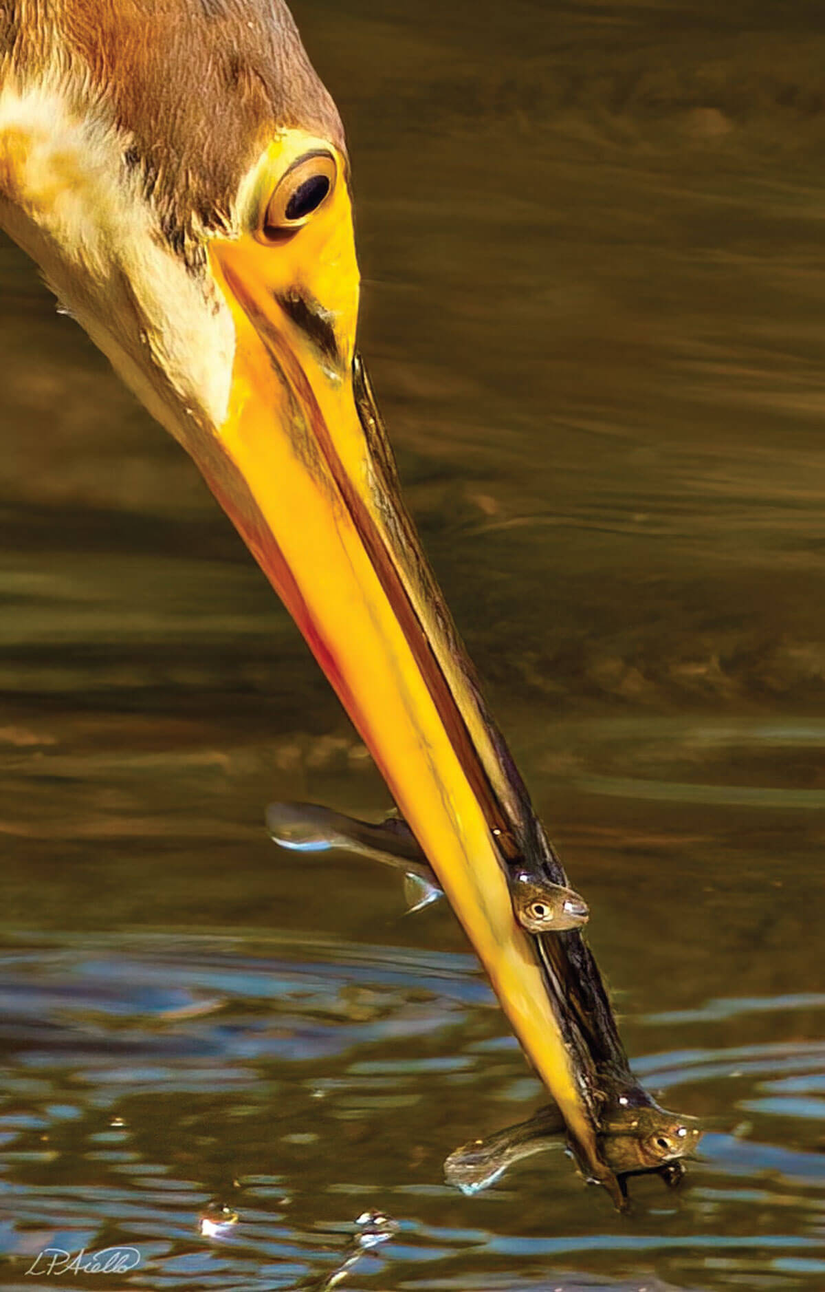 Less than ONE second after plunging its head into an alligator breeding marsh in Orlando, Florida, this juvenile Tricolored Heron (Egretta tricolor) emerges having captured two fish simultaneously in its beak for its morning meal.