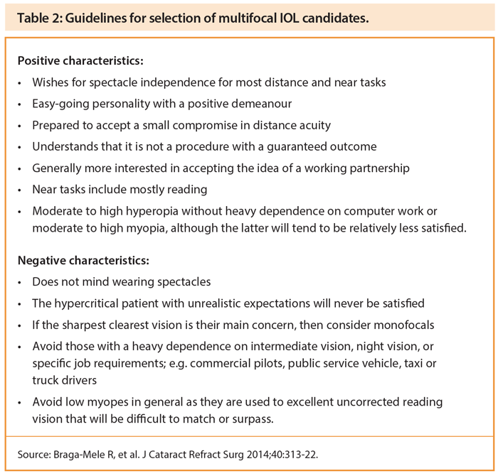 Appropriately selected patients can achieve spectacle independence and good visual outcomes at both near and distance with multifocal IOLs, but careful case selection and preoperative clinical evaluation is crucial to postoperative success (Table 2) [5]. Members of an American Society of Cataract and Refractive Surgery (ASCRS) Cataract Clinical Committee noted in a recent paper that the most common reasons for patient dissatisfaction after multifocal IOL implantation are blurred vision due to ametropica, dry-eye syndrome posterior capsule opacification (PCO) or photic phenomena due to IOL decentration, retained lens fragment, PCO, dry-eye syndrome and large pupil [5].