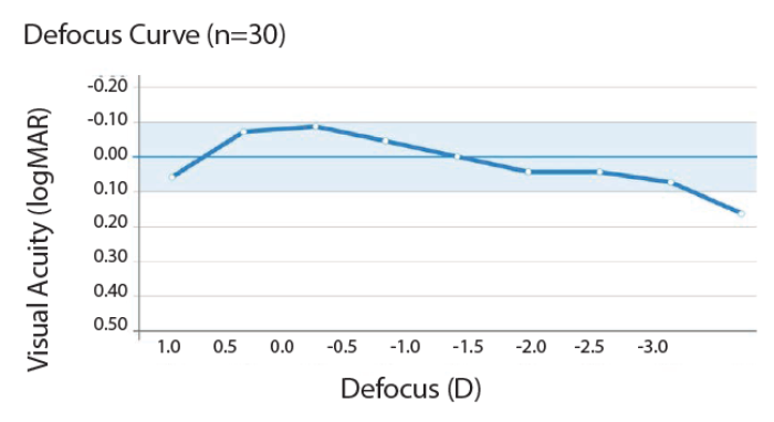 Supporting data comes from a three-month study involving 31 patients receiving the Tecnis Symfony IOL in both eyes compared to 10 patients implanted with Tecnis monofocal IOLs. At three months, visual acuity was significantly (p<0.05) better with Tecnis Symfony compared to the monofocal lens at intermediate (0.031 vs. 0.171 logMar) and near vision distances (0.195 vs. 0.396 logMar) (or 20/20 vs. 20/32). In addition, a two-line improvement in mean near and intermediate visual acuity was seen. The defocus curve for the Tecnis Symfony demonstrated a significant (p<0.05) increase in depth of focus, with a two-line visual acuity improvement through the range of defocus between -1.5 and -3.5D. Patients implanted with Tecnis Symfony IOLs experienced high spectacle independence at three months’ follow-up: 87% close at hand, 94% at arm’s length and 100% at a distance, respectively.