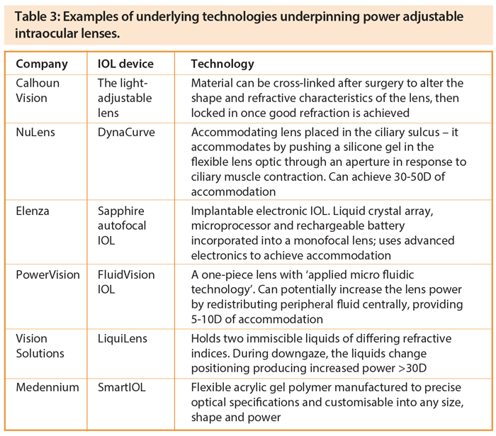 There’s an exciting range of novel IOL technologies that are now available or in development, most interest focused on power adjustable lenses and different approaches to accommodating IOL technology (Table 3) [6].