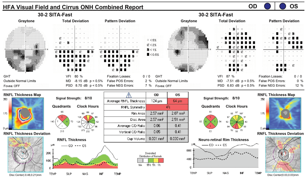 Figure 2: Combined report of bilateral Humphrey visual fields and optical coherence tomography scanning (OCT) showing a right inferior arcuate field defect and a superior arcuate field defect with some accompanying inferior losses in the left eye. OCT of the optic discs revealed thinned retinal nerve fibre layers in both eyes topically corresponding to the observed visual field defects.