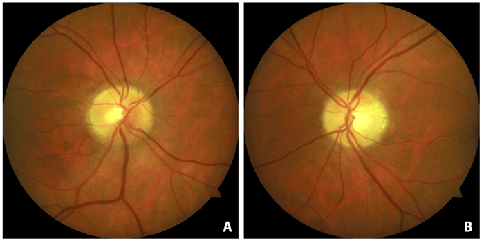 Figure 3: Complete resolution of the telangiectatic vessels on the disc in the right (A)