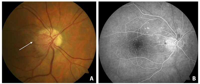 Figure 1: Disc photograph of the right eye (A) at the time when the panretinal laser photocoagulation was erroneously scheduled. Note the disc oedema and small haemorrhages (white arrow). (B) Fundus fluorescein angiography showing sectorial dilatation and angiographic leakage in the corresponding areas, but no neovascularisation.