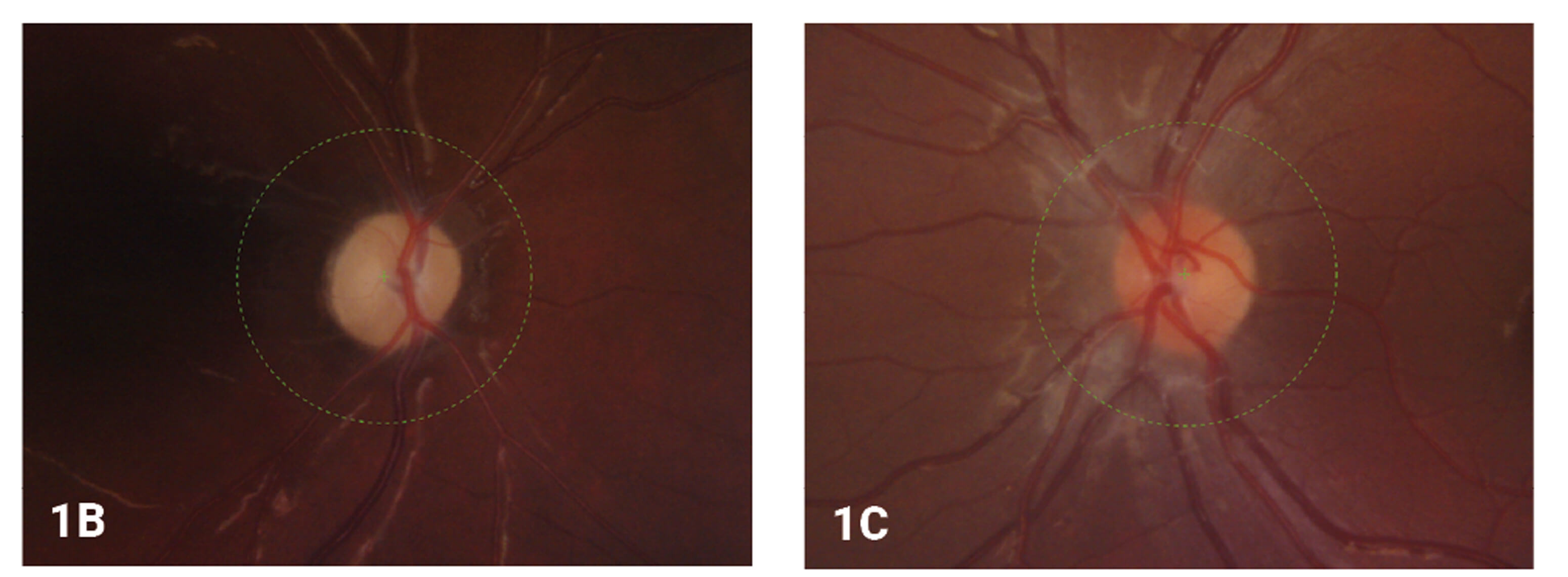 the close-up view of the optic disc of the b) right eye and c) left eye.