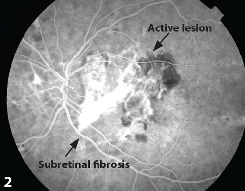 Figure 1: Fundal photo demonstrating active lesion and angiod streaks.
