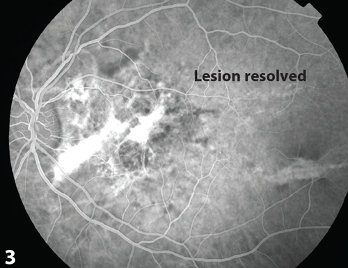 Figure 3: Resolution of lesion demonstration durring aterio-venous phase of FFA, post-treatment.