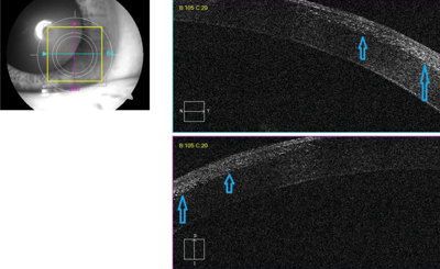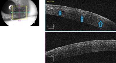 Anterior segment OCT showed diffuse hyper-reflective dots in the flap-stromal interface (Figure 3). A clinical diagnosis of diffuse lamellar keratitis was made.