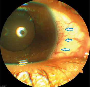 Figure 1: Marked degree of diffuse conjunctival injection as well as circum-limbal injection (arrows).