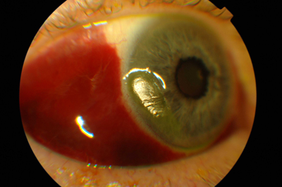 A 67-year-old man presented to Eye Casualty with a red, painful right eye, with blurred vision. He had been cutting grass with a strimmer and thought a foreign body had flown up from the strimmer into his eye. The man had left home straight away to seek medical attention and at time of review, it had been approximately 90 minutes since his accident.