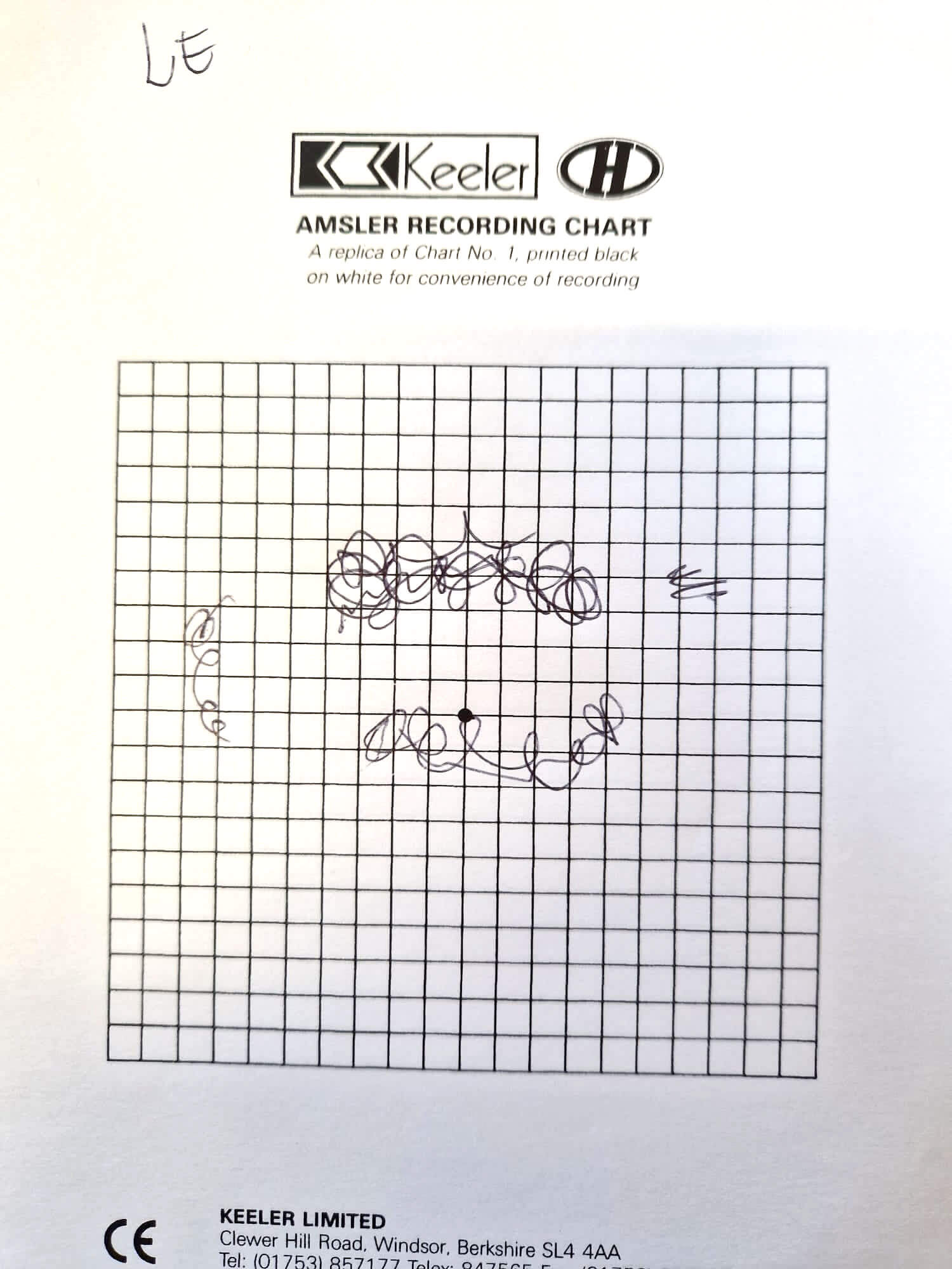 Figure 3a and 3b: Amsler grid drawings, showing deep central scotomas of