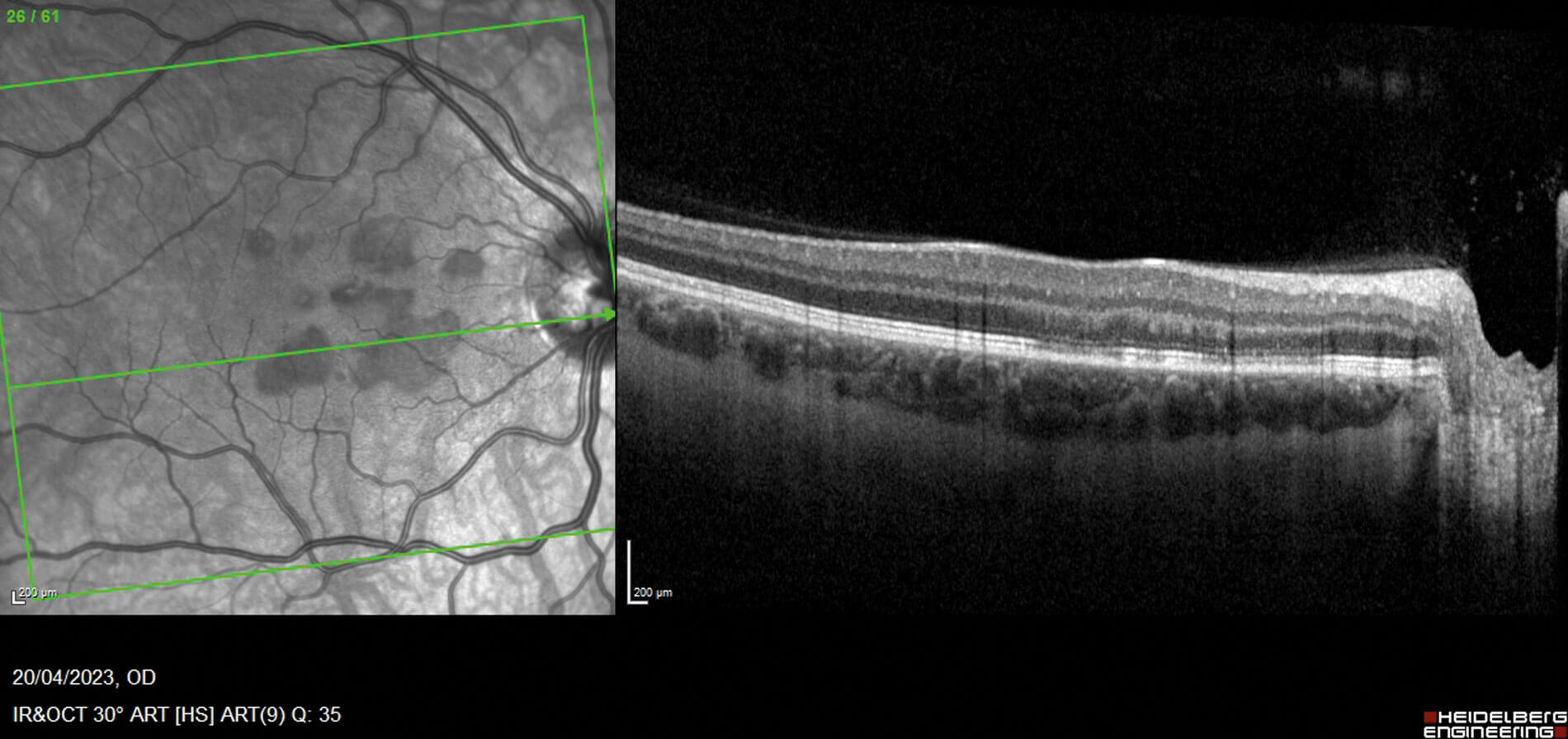 Fundoscopy showed evidence of discrete foveal reflex changes, which on further evaluation with optical coherence tomography (OCT) macular view showed multiple areas of outer retinal disruption (see Figures 1a and 1b). Optical coherence tomography angiography displayed evidence of reduced flow in the deep retinal plexus, consistent with ischaemia (Figures 2a and 2b). These retinal imaging findings correlated with the patient’s subjective visual changes, as noted on their Amsler grid drawings (see Figures 3a and 3b).