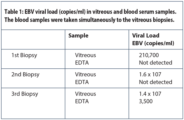 She underwent vitreous biopsy which was negative for HSV, VZV and adenovirus but detected low levels of EBV and cytomegalovirus (CMV) on PCR. Serum serology (IgG) was also positive for EBV but negative for toxoplasmosis. The vitreous biopsy was repeated two weeks later as there was increase in ocular inflammation and PCR detected only rising levels of EBV (Table 1). She underwent vitrectomy two months later, due to persistent vitreous opacities, and once more the PCR confirmed only the presence of EBV. There were no concurrent symptoms of infectious mononucleosis.