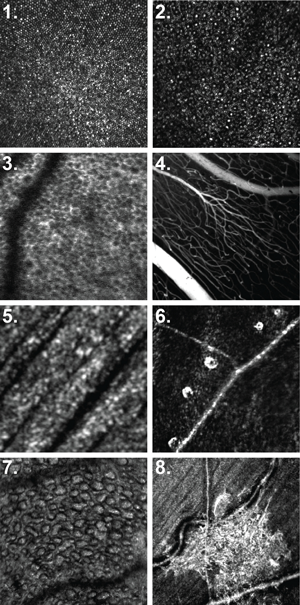 Figure 2: In vivo images acquired with Adaptive Optics Scanning Laser Ophthalmoscope (AOSLO). 1) Macular cone photoreceptor mosaic. 2) Rod and cone photoreceptor mosaic. 3) Retinal pigmented epithelium mosaic. 4) Contrast aided angiography. 5) Retinal nerve fiber layer (RNFL) 6) Inner retinal blood vessels without contrast. 7) A cross-sectional view of micro-retinal cysts in a patient with retinitis pigmentosa. 8) Hyper-reflective area in the RNFL in a patient with glaucoma. These patches are not observable with conventional imaging and studies are ongoing with regard to their exact aetiology. Courtesy of Professors Carroll and Dubra.