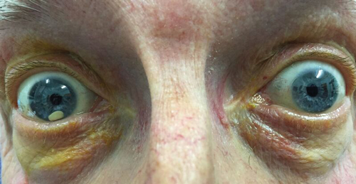 Mr B went to a ‘blind school’ for his poor eyesight and it was not until later in his life that an optician figured out that with a very strong plus prescription he could actually see not too badly. The strong prescription was necessary because his crystalline lenses both fully dislocated making him aphakic in both eyes. Apparently, in the 1980s, Moorfields Eye Hospital investigated him for possible Marfan’s but no records prevailed and Mr B did not have any other symptoms indicative of that or another systemic condition. Indeed, he was generally fit and healthy when he went to see his optician last year for a foreign body he noted in front of his right iris (Figure 2). His corrected visual acuity with his heavy glasses (he did not tolerate contact lenses) measured 6/12 and 6/9 right and left, respectively.