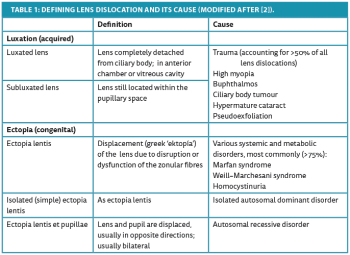 Anterior dislocation of the crystalline lens can result in complications such as corneal oedema, acute glaucoma or uveitis. Unlike a lens dislocated into the vitreous cavity, an anteriorly dislocated lens should always be removed because of possible devastating complications from endothelial cell loss or secondary glaucoma [1]. In most cases trauma is the cause of the dislocation, but other causes are possible as well (Table 1).