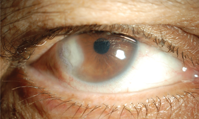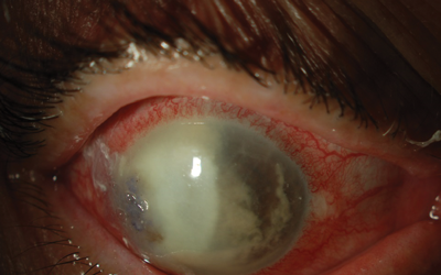 Initial results yielded evidence of Streptococcus pneumonia. Intensive topical hourly penicillin treatment was commenced with a good initial response. A tapered regimen was continued for a further five weeks while she was closely monitored. At month three (after cataract surgery), the patient’s eye deteriorated again. Vision had now reduced to count fingers and the eye was increasingly painful. There was signs of corneal perforation due to extensive stromal infiltration and thinning. There was associated hypopyon and satellite lesions were visible on the stroma (Figure 2). The perforation was sealed with Histoacryl glue. An aqueous tap and corneal re-scrape were obtained. Both specimens showed Fusarium dimerum. Intensive hourly topical natamycin 5% was instigated, with oral voriconazole 200mg. An intracameral injection of amphotericin B was also given. An alternative ocular preparation of voriconazole was not available for use.