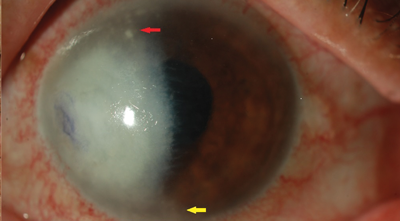 This is covering nearly half of the cornea. Red arrow is pointing to satellite lesions and yellow arrow directs to hypopyon.