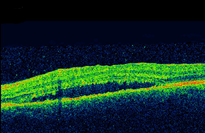 Further dilated ophthalmoscopy examination of the retina revealed hyperaemic, swollen disc and multiple discreet yellow placoid patches of necrotising retinitis on the retinal periphery. On the temporal side, a few lesions extended within the vascular arcades. There were a few retinal haemorrhages, and patches of arteriolitis in the periphery (Figure 1). The right eye was quiet. Macular optical coherence tomography (OCT) demonstrated sensory macular detachment without any cystoid macular oedema (Figure 2). The fundus fluorescein angiography illustrated early hypofluorescence with delayed hyperfluorescence. There was no focal or diffuse leak in the macular area. He was otherwise fit and well.