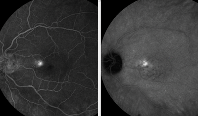 A working diagnosis of acute retinal necrosis (ARN) was made. The natural history of ARN is circumferential progression and development of retinal detachment with a guarded prognosis and as such, he was urgently commenced on intravenous acyclovir for two weeks. After the initial 48 hours of IV antiviral treatment oral prednisolone was also started. After this period, the IV acyclovir was switched to oral valacylovir. He also had prophylactic barrage Argon laser retinopexy to the retinal lesion. Nevertheless, despite clinical improvement of the peripheral lesions, the sensory macular detachment persisted and deteriorated. At this stage, additional fundus fluorescein angiography (FFA) and indocyanine green (ICG) angiography studies revealed a focal leak (hot spot) reminiscent of an inkblot appearance due to central serous retinopathy (Figure 3). Therefore, oral steroid was weaned off. Consequently, the subretinal fluid (SRF) was reduced and after six weeks, his vision improved to 6/6.