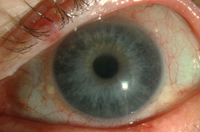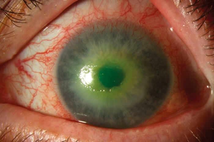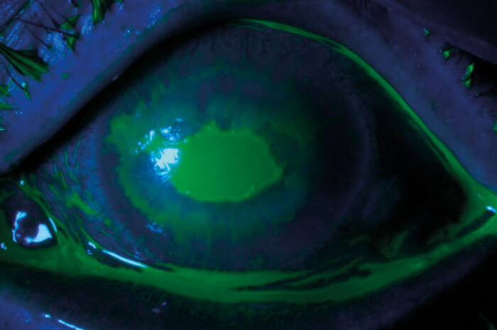 A 67-year-old retired female nurse presented with persistent, bilateral, non-healing (>6 weeks) corneal ulcers and stromal ring infiltrates (Figures 1 and 2). The epithelial defects were the result of chemical burns caused by her contact lenses which had been stored in enzymatic cleaning solution.