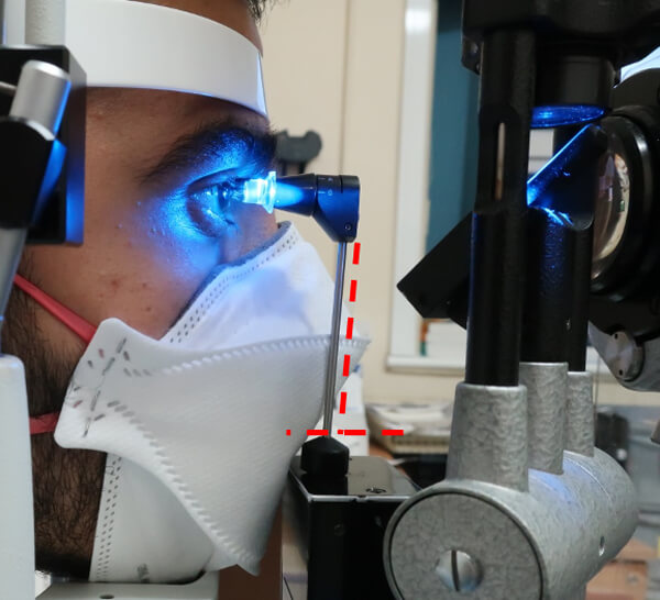 Figure 1: Photograph of a patient having his IOP checked with the Goldmann applanation tonometry technique. He is wearing a FFP3 mask. Note the tilt of the head of the tonometer. Due to a bulky mask this no longer is perpendicular to the eye as highlighted by the red dashed line.