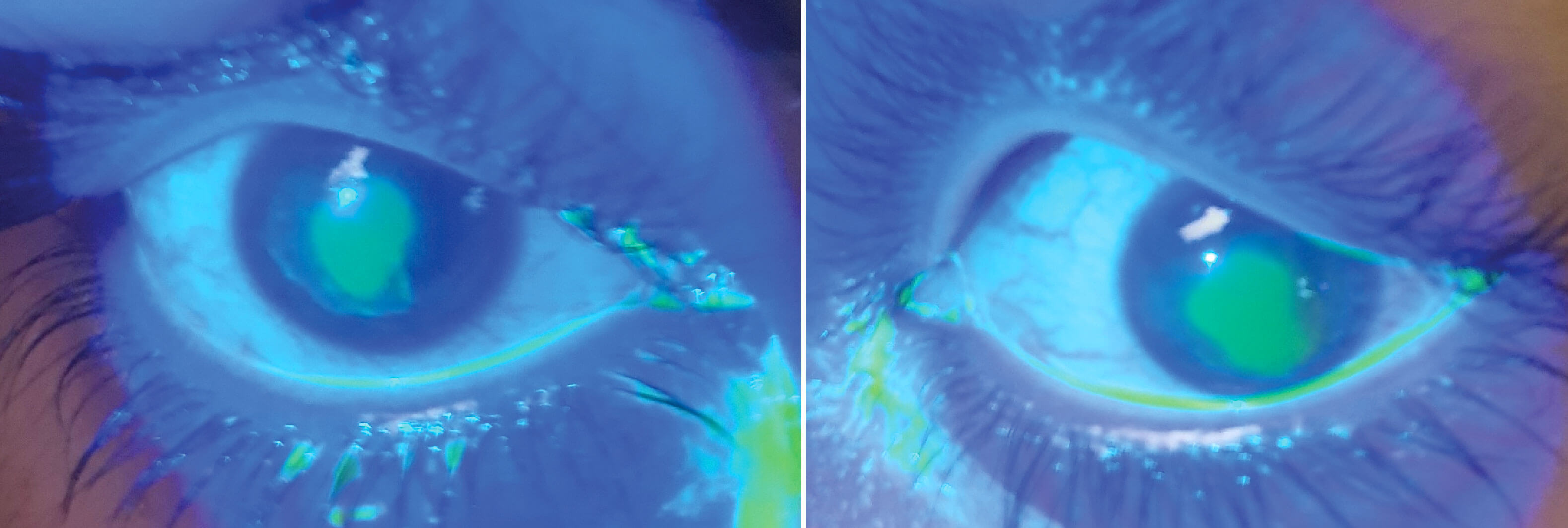 At the eye casualty unit, his LogMAR visual acuities (VA) were 0.80 unaided, improving to 0.60 with pinhole in the right eye and 1.00 unaided, improving to 0.50 with pinhole in the left eye. Central corneal epithelial defects measuring 4.0mm x 3.5mm and 5.0mm x 4.5mm in the right and left eyes were noted (Figure 1).