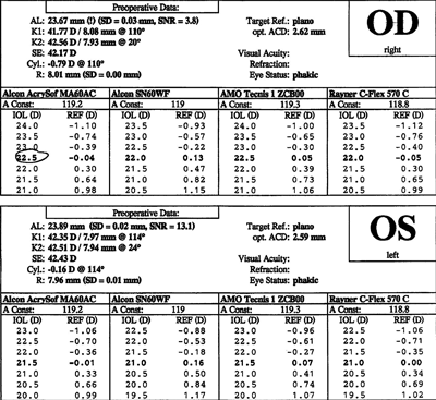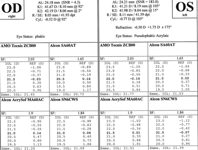 We work at different places with different measurement devices and different print outs. Make sure you check the biometry to ensure that the appropriate formula is being used and the right and left eye print outs are where you think they are. Figure 1 shows a print out with the right and left eyes split vertically, whereas Figure 2 shows a print out with the right above the left. This led to a clinical error in IOL selection.