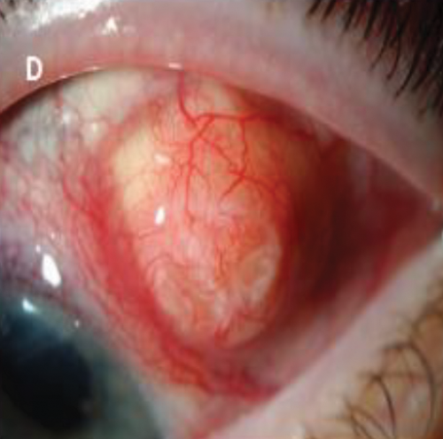 Subsequently, Molteno implant was performed with patch graft and the patient continued to be asymptomatic for a few years until she experienced left ocular irritation. On examination, left eye showed patent inferior and superior iridotomies with two clear tubes (Image C), two scleral patch grafts; the lateral one was more swollen with a diagnosis of patch graft complicated anterior scleritis. Topical steroid drops were initiated. One week later, symptoms improved and examination showed moderate inflammation overlying the scleral patch graft. She was then started on PO Prednisolone 10mg daily and continued to improve. Prednisolone tablets were tapered by 1mg every two weeks. Four months later, visual acuity (VA) was stable at CF (6/60 PH) with quiet eye (Image D) and IOP was 14mmhg.