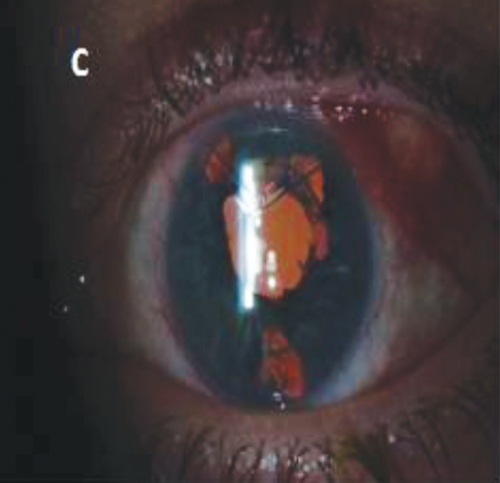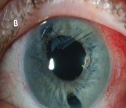 A 48-year-old lady had been referred by the optometrist in February 2012 for left eye redness (Image A). Past medical history included type-2 diabetes and ophthalmic history includes left phaco-vitrectomy with silicon oil (longstanding retinal detachment) more than 10 years ago. This was complicated by pupillary-block glaucoma, which required inferior YAG peripheral iridectomy (PI) (Image B), topical and systemic treatment. Later superior iridotomy (Image B) was performed. Intraocular pressure (IOP) kept fluctuating, while vision was stable at counting finger (CF) (6/60 pinhole (PH)). Ahmed valve implant was then undertaken with scleral bovine pericardium patch graft sutured with 9-0 nylon sutures. IOP was controlled for five months.