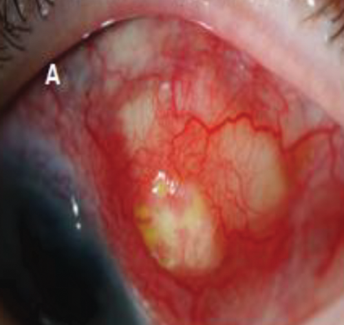 Figure 1: A shows a localised area of anterior scleritis overlying the donor pericardium scleral patch graft;