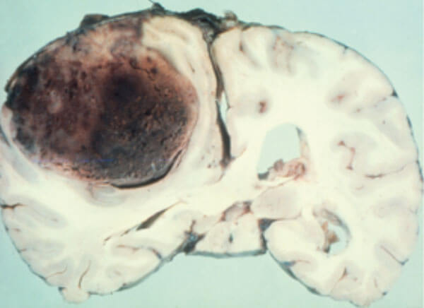 Figure 2: Pathology of large convexity meningioma compressing the brain with intrinsic haemorrhage.