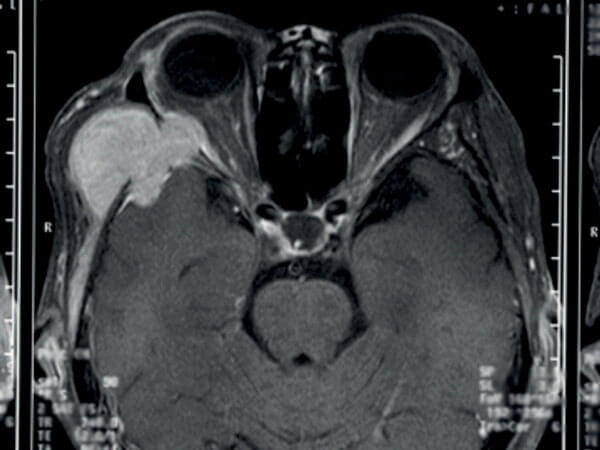 Figure 1: Brain MRI scan showing a lateral sphenoid wing meningioma invading the orbit.