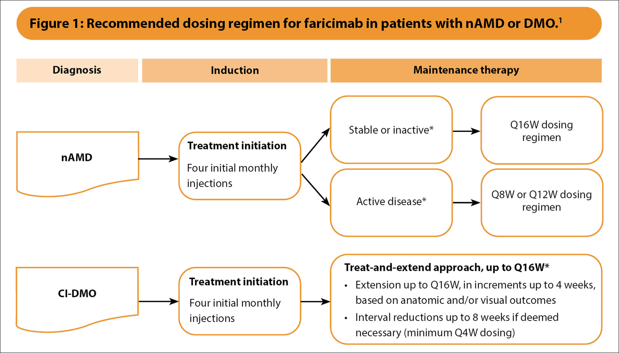 The recommended dosing schedules for faricimab in treating nAMD and DMO are summarised in Figure 1 [1]. The product label states that faricimab must be administered by a qualified healthcare professional trained in intravitreal injections, reflecting UK clinical practice where most intravitreal injections are given by specialist nurses and optometrists [1].