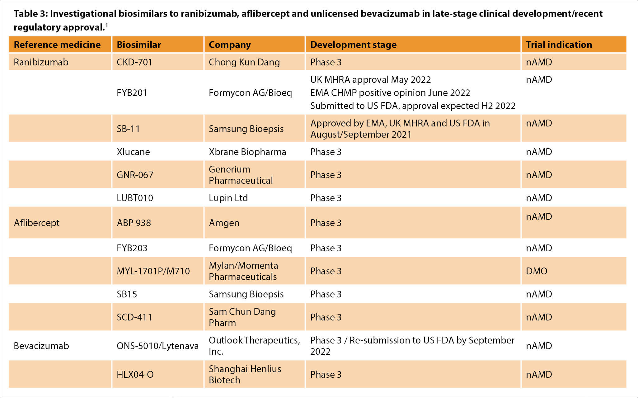 Several investigational biosimilars to established intravitreal anti-VEGF therapies are in late-stage development (Table 3) [9,10]. Two ranibizumab biosimilar medicines recently authorised include SB-11 (Byooviz, Samsung Bioepis), approved by European Medicines Agency (EMA), UK MHRA and US Food and Drug Administration (FDA) in 2021, and FYB201 (Ongavia, Midas Pharma GmbH), licensed by the UK MHRA in May 2022 [11-13].