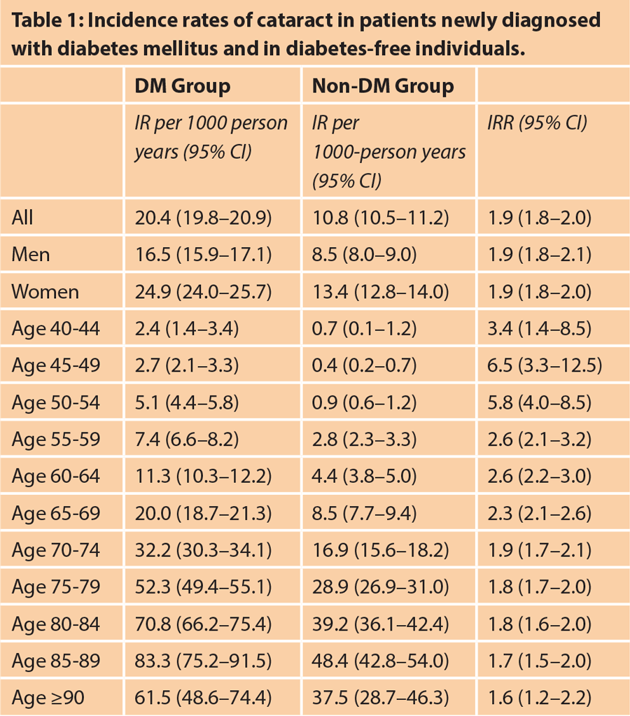 - The highest incidence rate ratios, the ratio of IRs between DM and non-DM groups, were observed in those aged 45 to 54 years. Diabetics of this age were considerably more likely than non-DM individuals to develop cataract. Indeed, in this age range, DM patients were between 5.8 and 6.5 times more likely to suffer from cataract than age matched non-DM individuals.