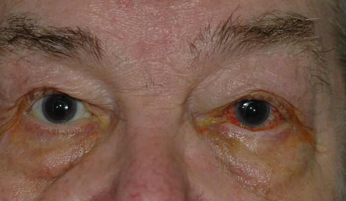 A 76-year-old male presented to the eye emergency clinic with four months history of left eye redness lid swelling and irritation. This had got significantly worse in the last few days with spreading of the swelling. His symptoms are worse morning but generally get better as the day goes on. He also complained of pulse synchronous tinnitus. Past ophthalmic history includes bilateral cataract surgery and ingrowing eyelashes. His previous medical history includes hypertension and diabetes type II on treatment.