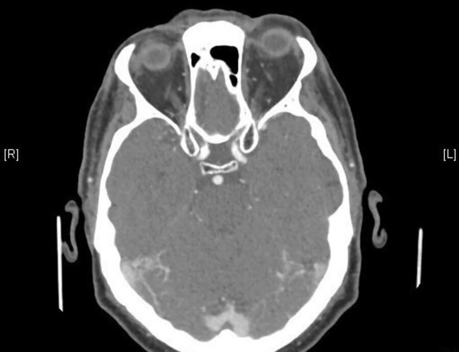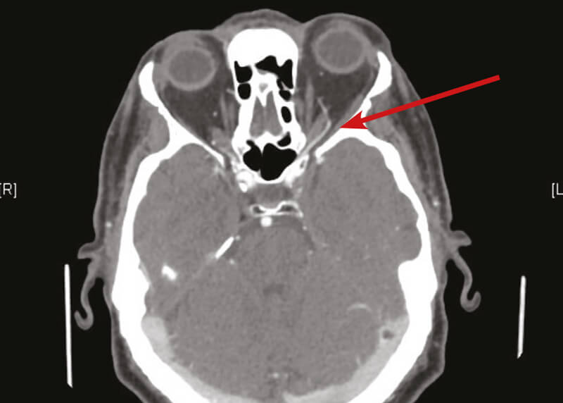 Figure 4: Enhancement of left superior ophthalmic vein suggestive of left CCF (red arrow).