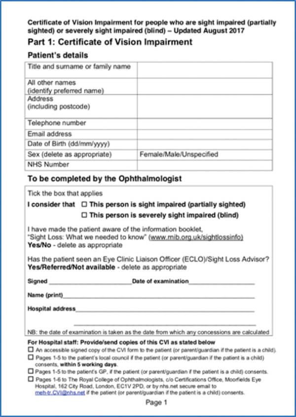 Examples of financial support includes subsidised council tax bills, free public transport passes, and reduced fees for TV licences. There are some concerns that despite the advantages, not all eligible patients are being certified as sight impaired and are therefore missing out on these benefits [3]. This short article will explain who is eligible for certificates of visual impairment, the process of doing so, and some of the practical help that can be offered to improve the lives of those living with visual impairment.